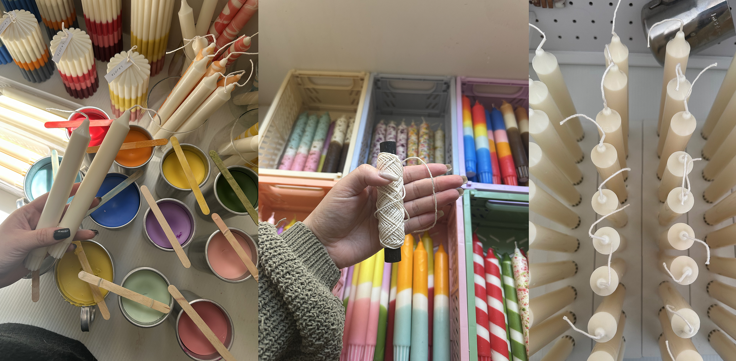 Cada vela é feita à mão e tingida individualmente com técnicas como DipDye e marmorização.