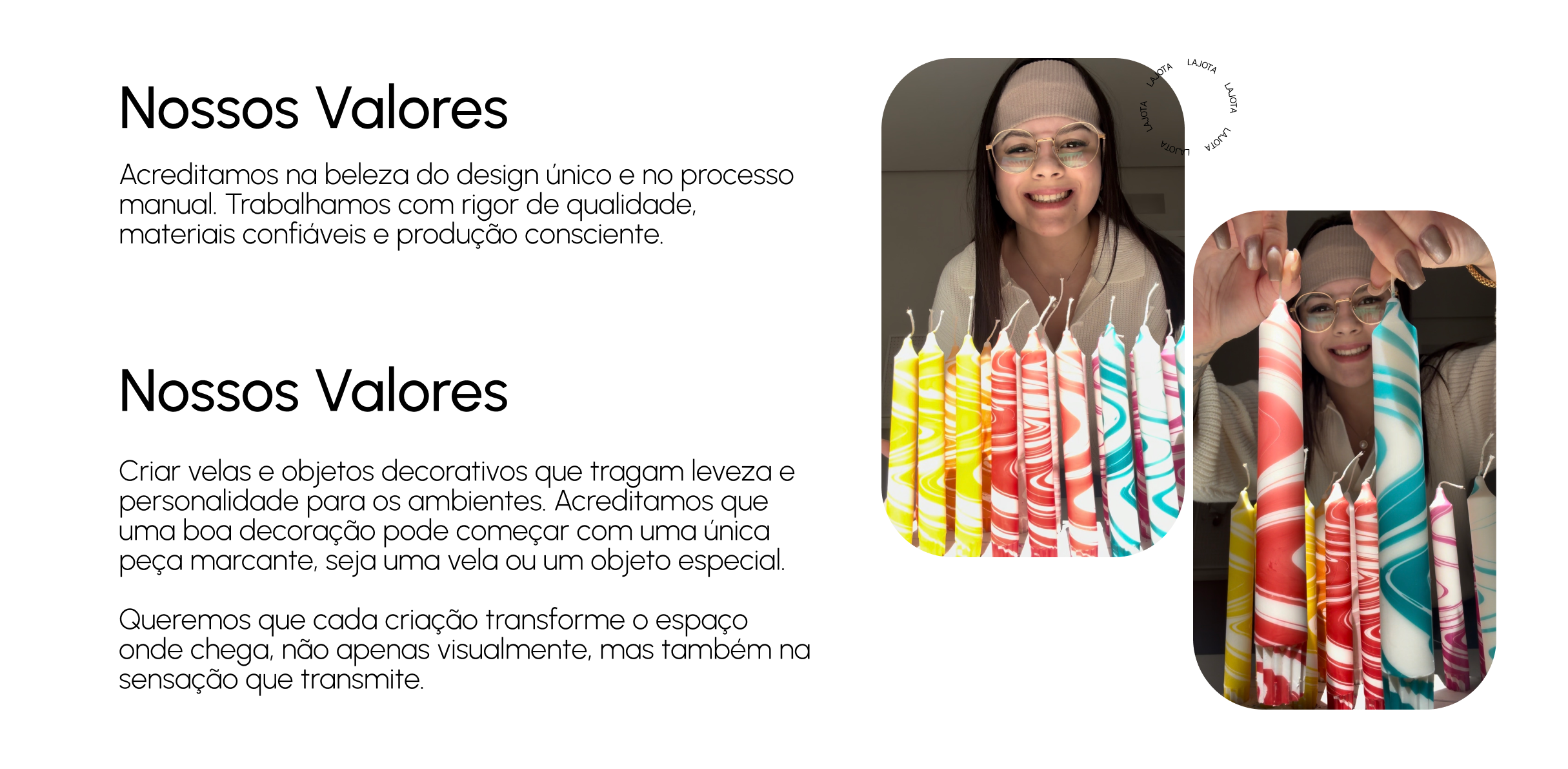A Lajota é uma marca brasileira que começou com foco em design de interiores, evoluiu para peças feitas com resina ecológica e, hoje, tem como essência a criação de velas decorativas.